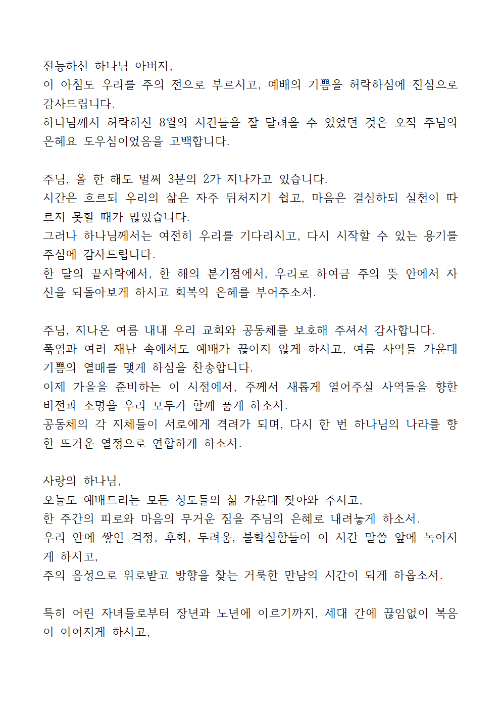 8월 다섯째 주일예배 대표기도문 2