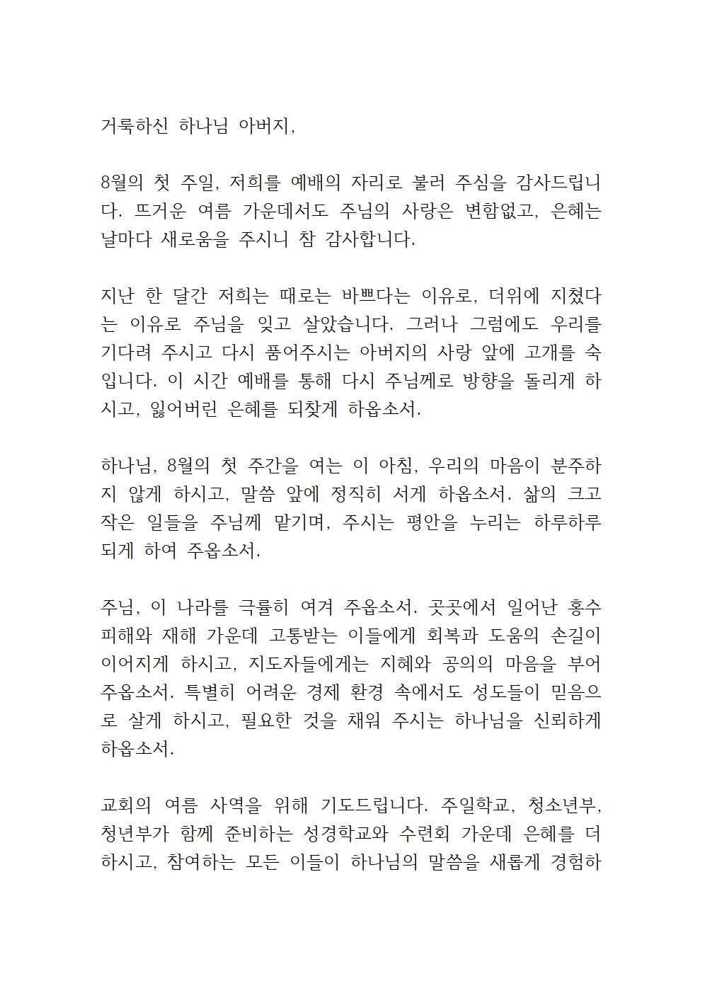새로운 한 달, 8월의 주일 예배 자리로 저희를 불러주시니 감사합니다.